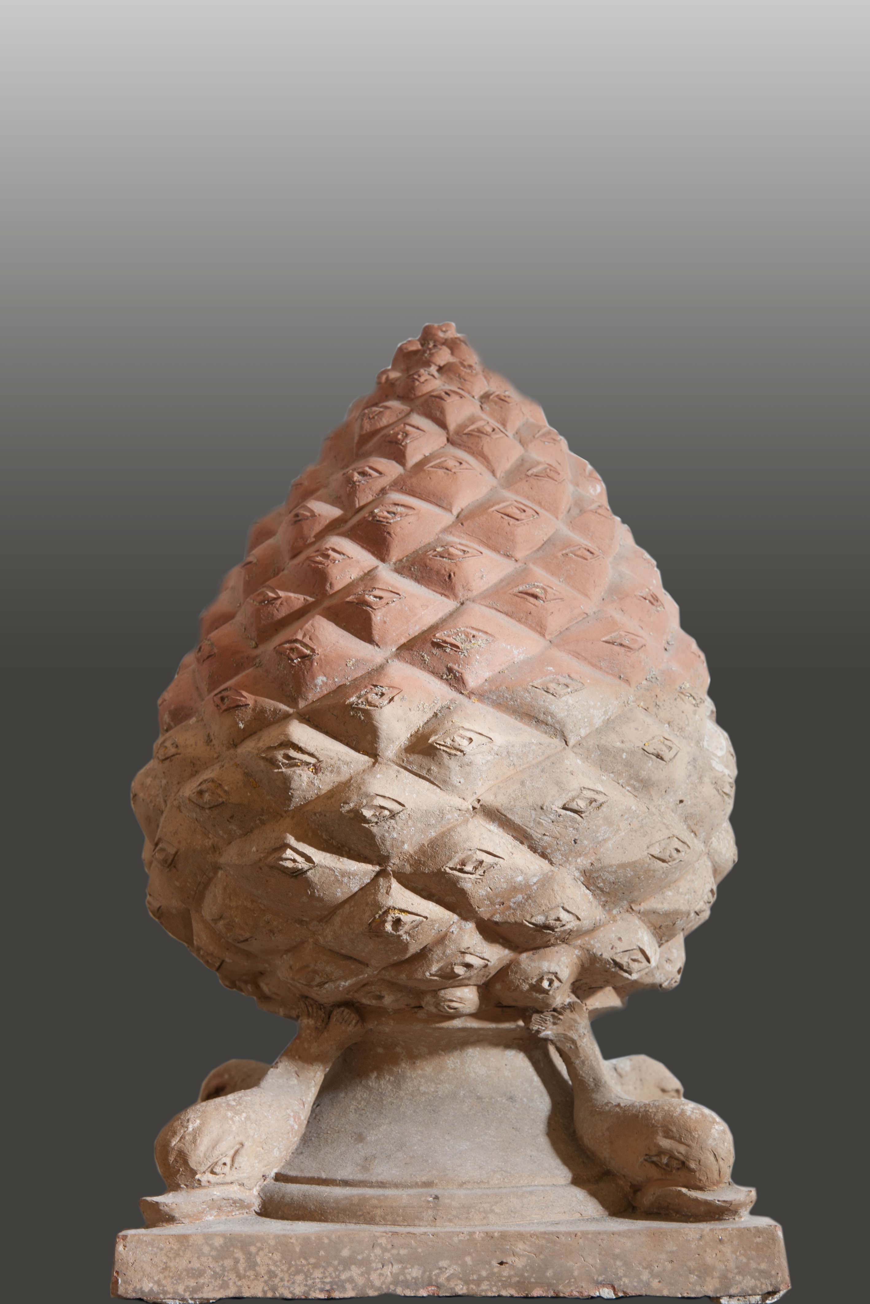 Coppia di pigne in terracotta con base quadrata poggiata su quattro delfini (37 cm di lato e 60 cm di altezza).