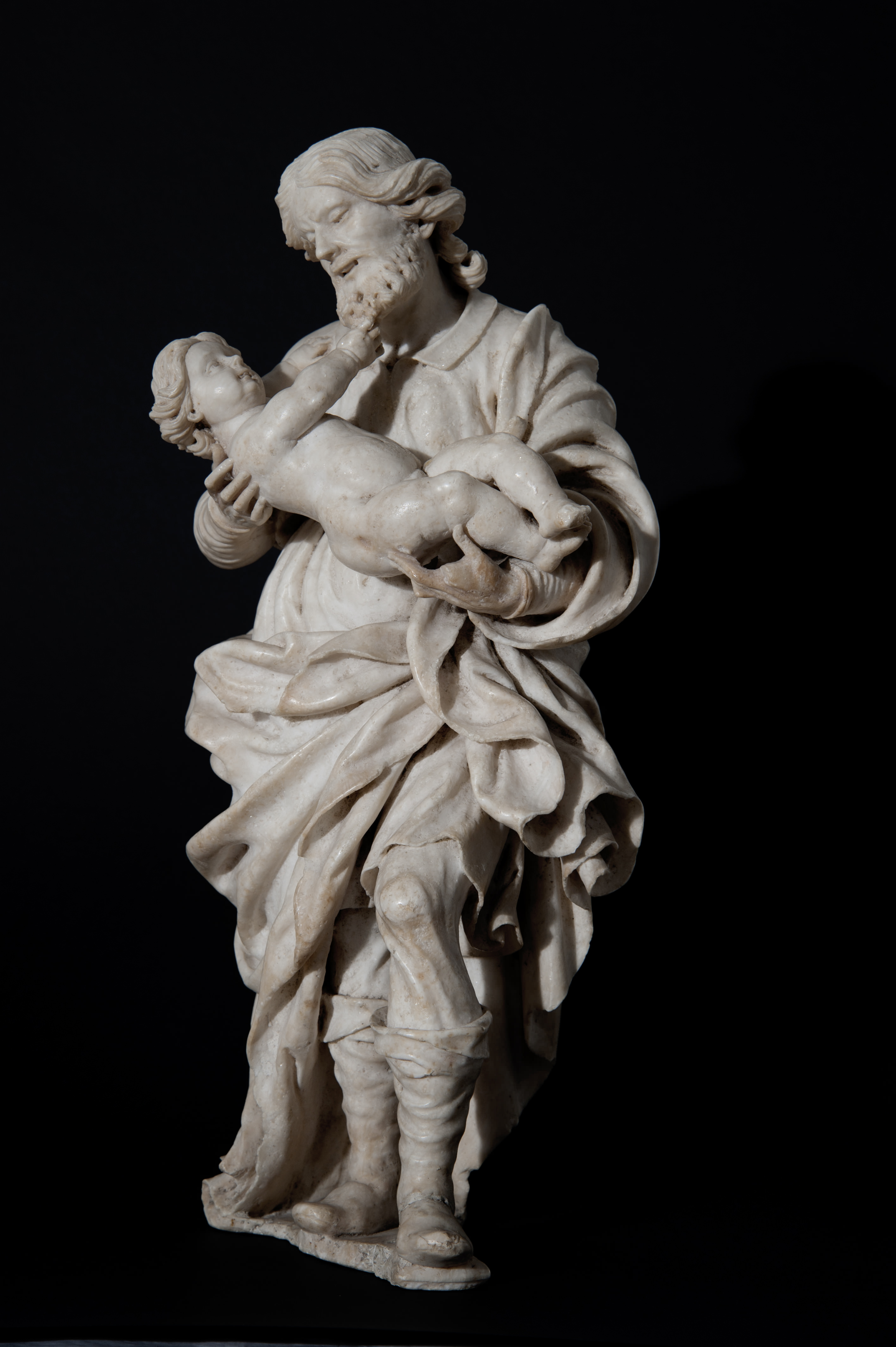 Il santo è raffigurato stante; ha il viso di forma allungata, incorniciato da lunghe ciocche bipartite sulla fronte che gli scendono sulle spalle; la barba ricciuta, carezzata teneramente dal bambino, accentua l'espressione felice del genitore, con le labbra socchiuse in un sorriso. Indossa una corta veste, stivali morbidi ed un manto ampiamente panneggiato.