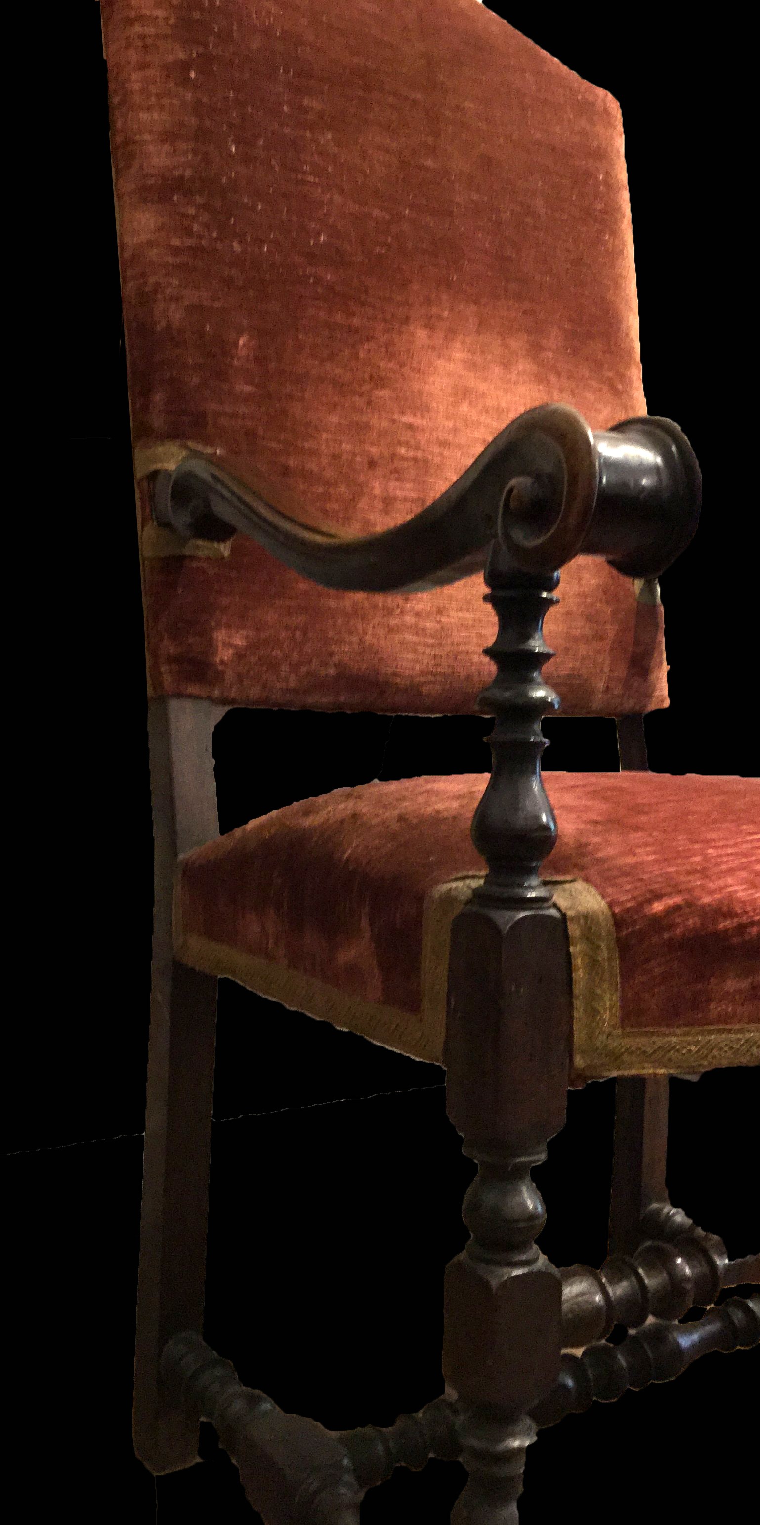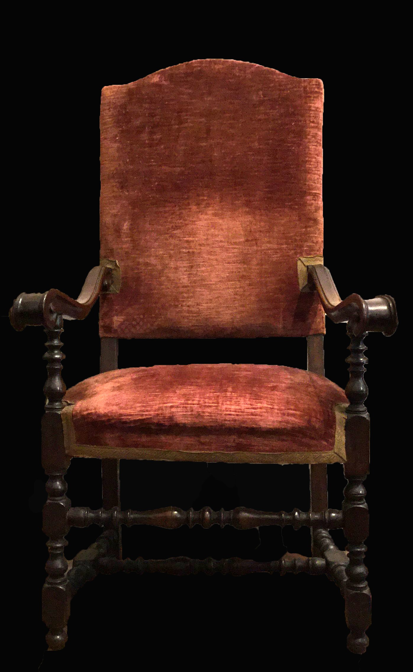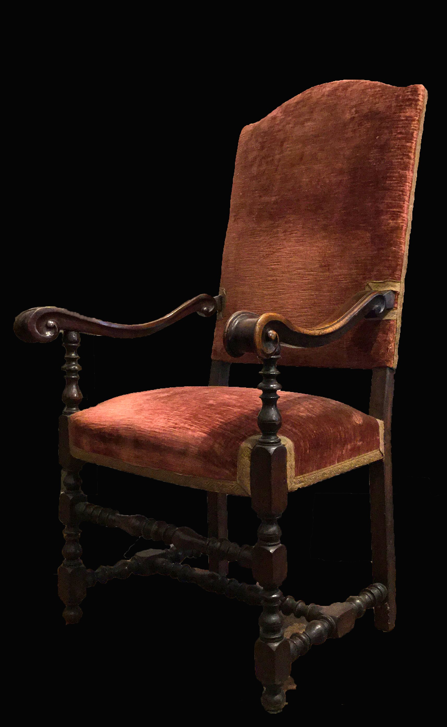 Grande seggiolone in legno intagliato e tornito con una alta spalliera sagomata nella parte superiore e con due braccioli finemente intagliati.