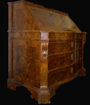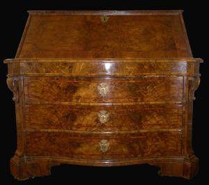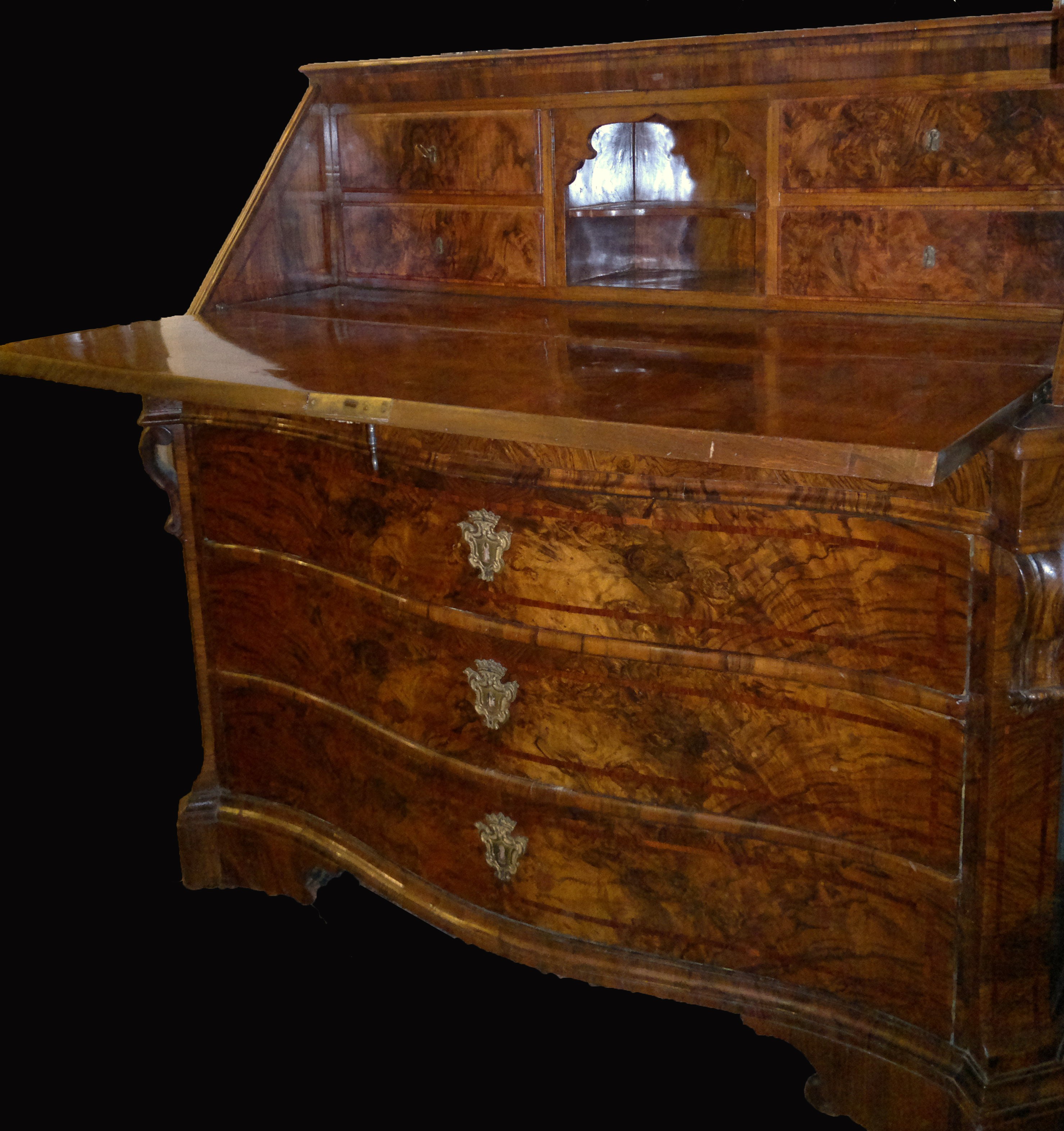 Importante ribalta Romana del 700 Luigi XIV, lastronata in noce e radica di noce