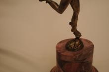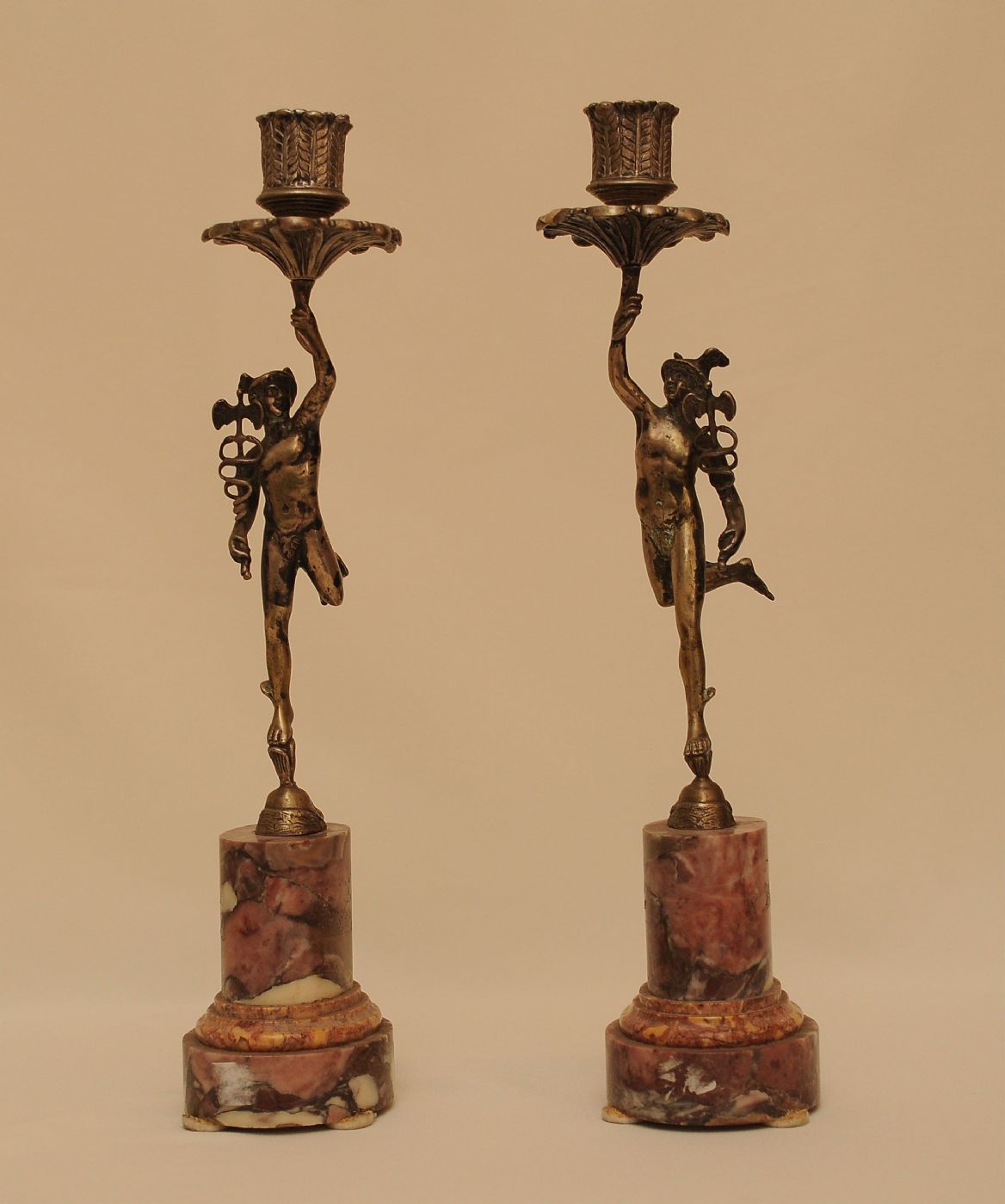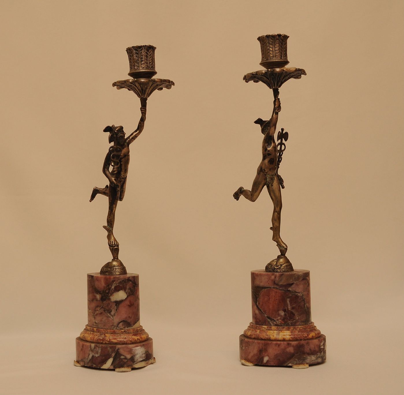 Coppia di candelieri periodo Impero in argento raffiguranti "Mercurio" poggiati su una base di marmo fior di pesco.