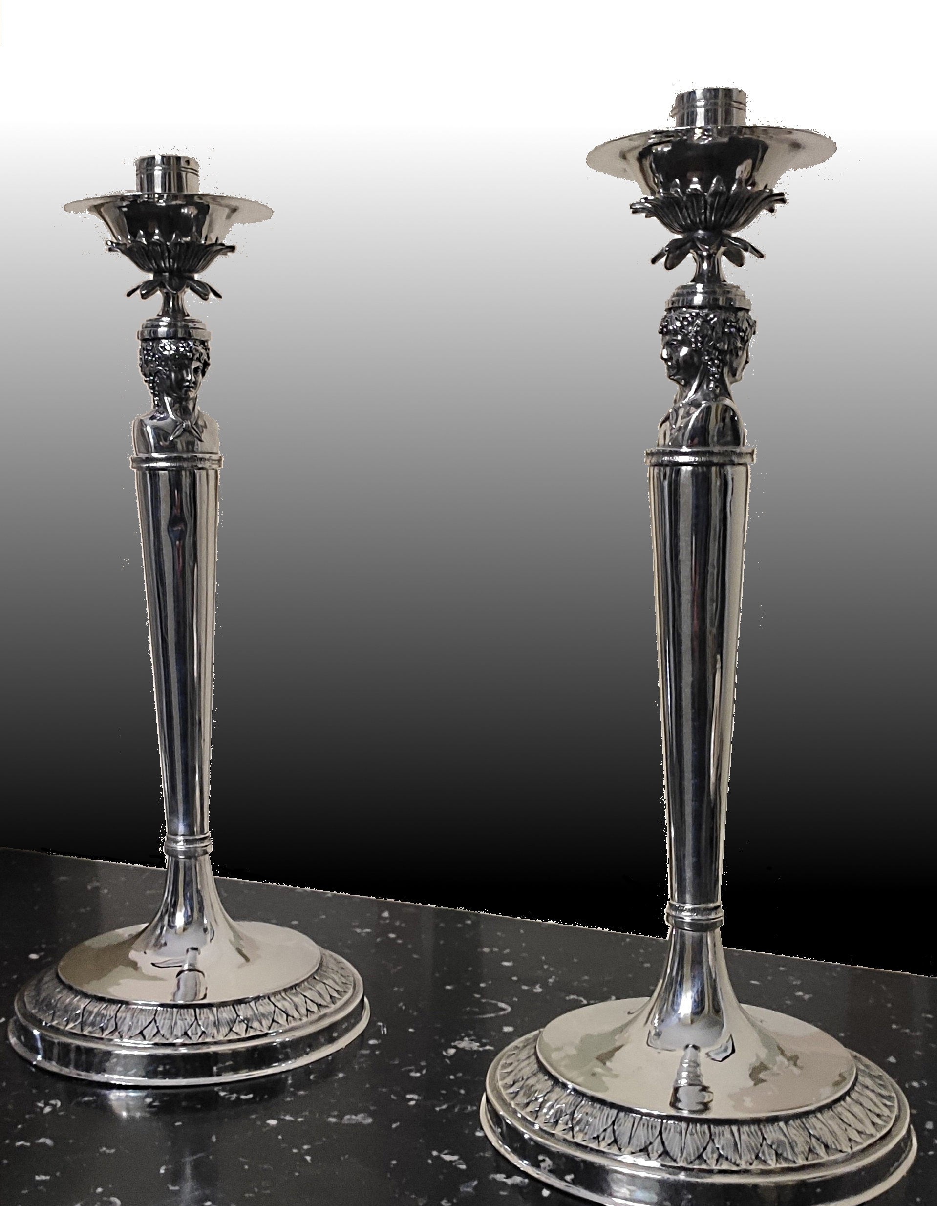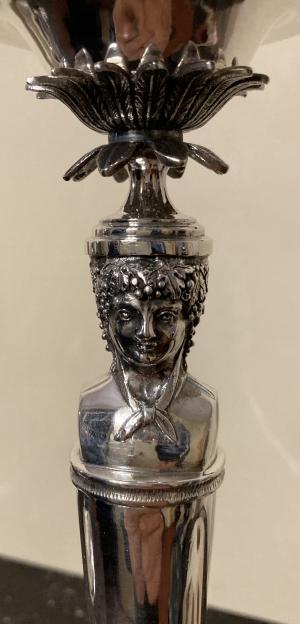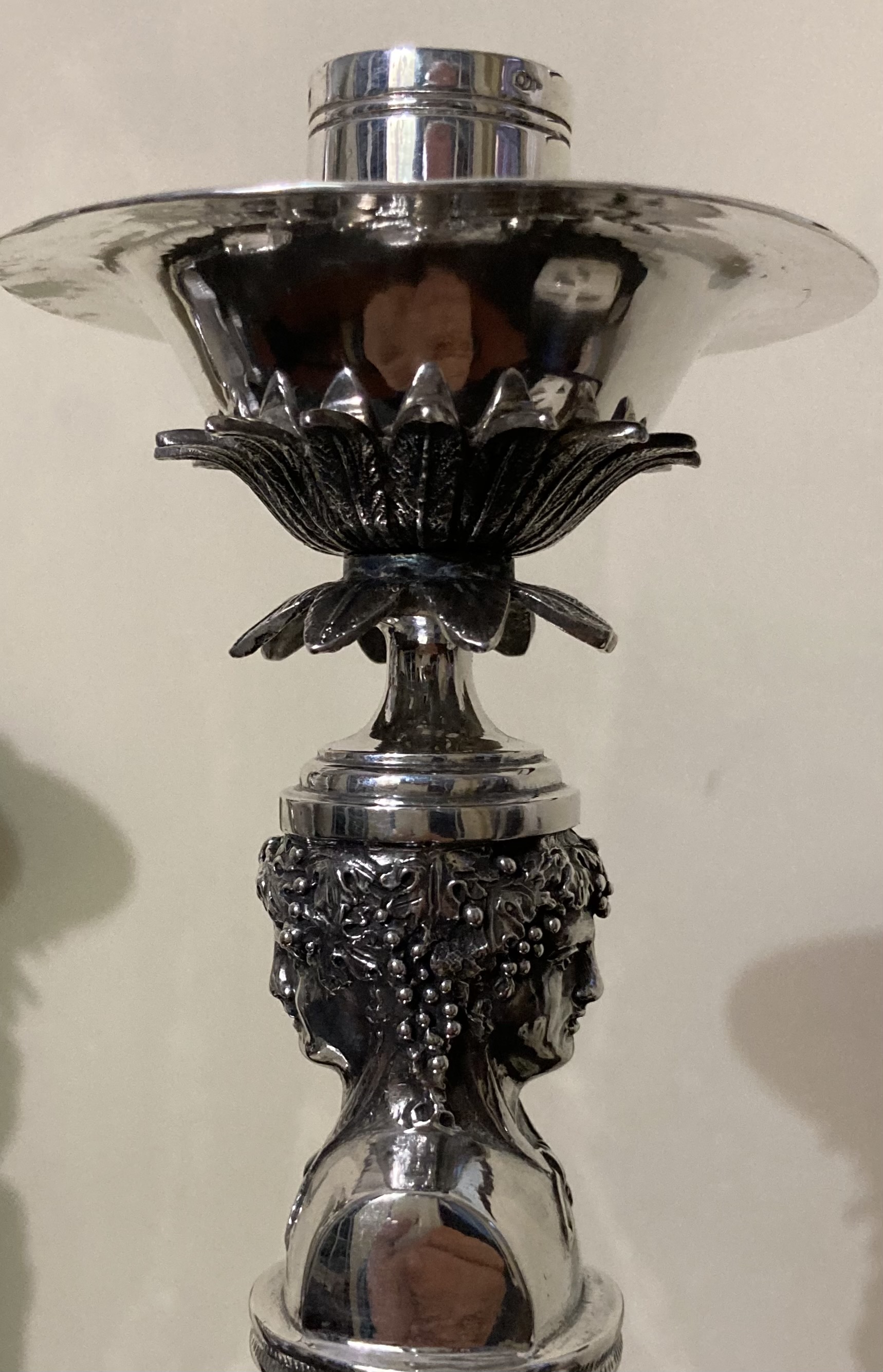 Coppia di candelieri in argento dove la testa di Giano bifronte sostiene i piattini dei bocciuoli portacandele.