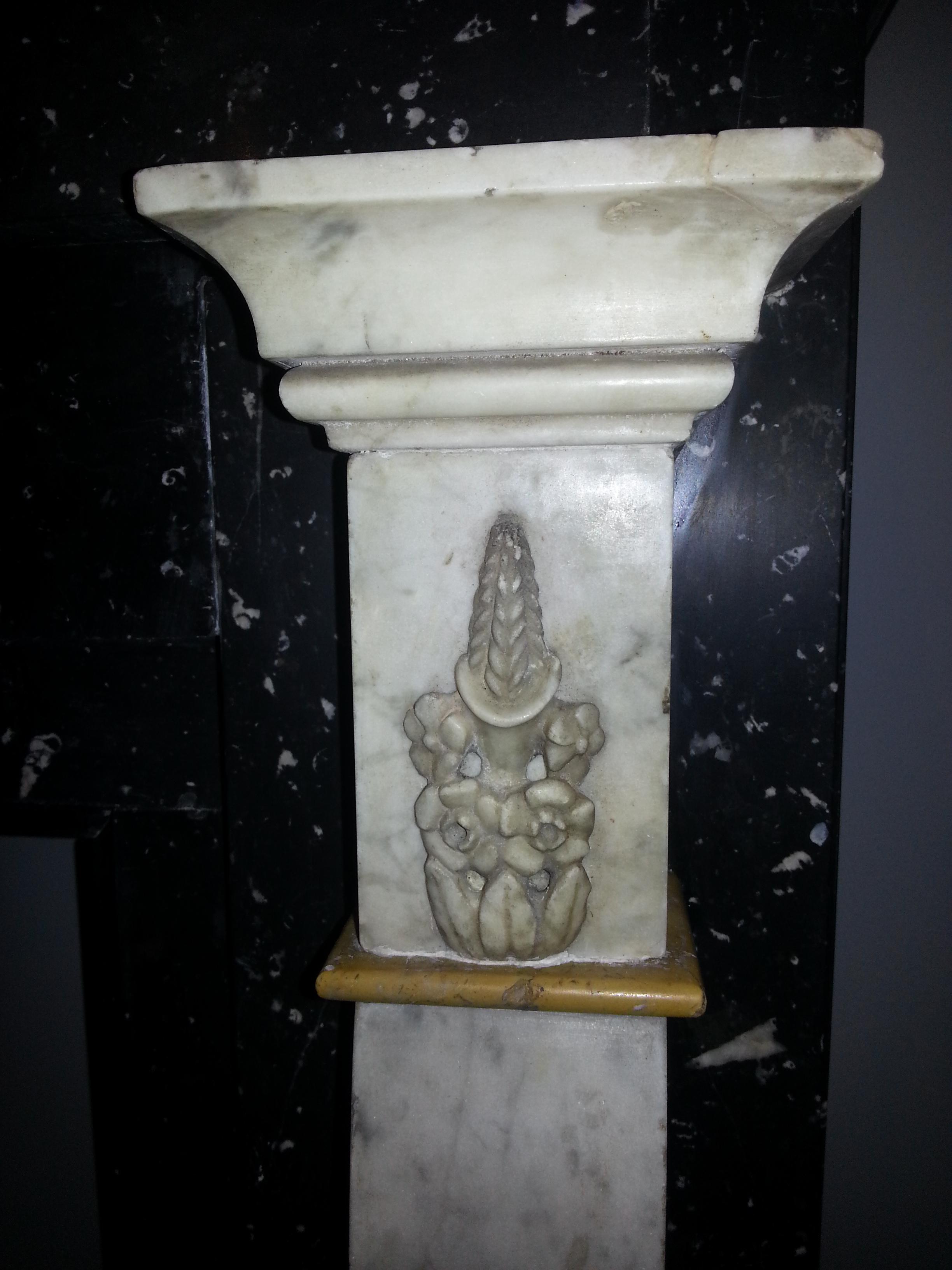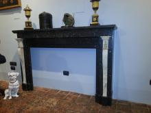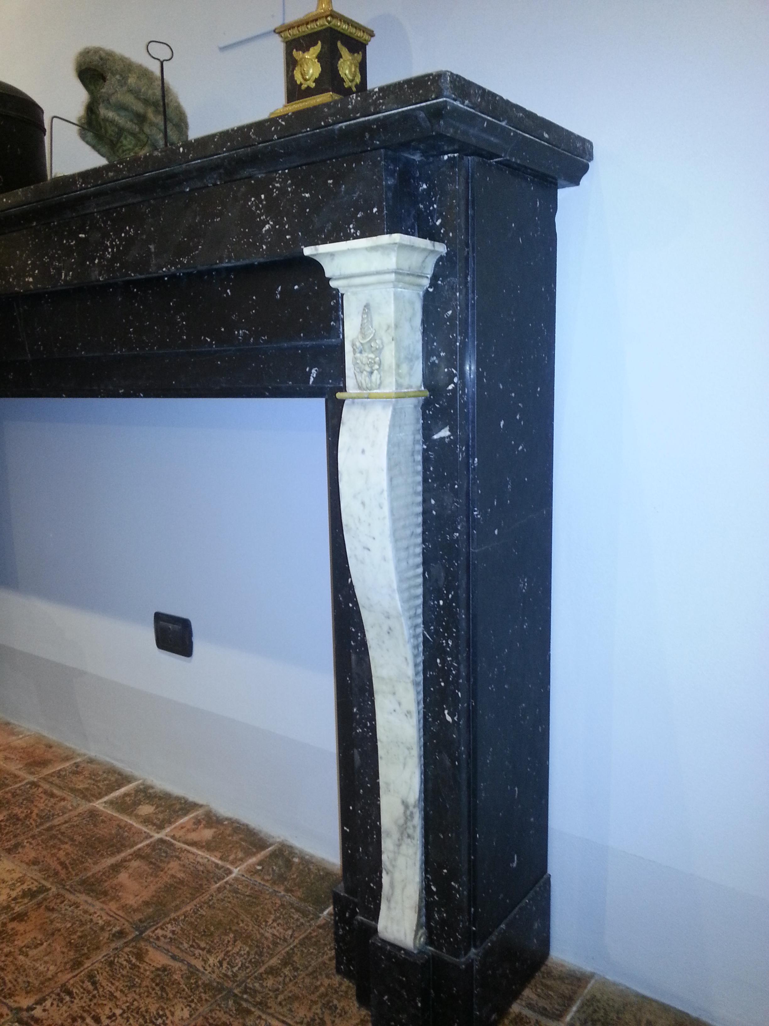 Camino della seconda metà del XVIII secolo in marmo nero antico con lesene in bianco Carrara e giallo di Numidia.