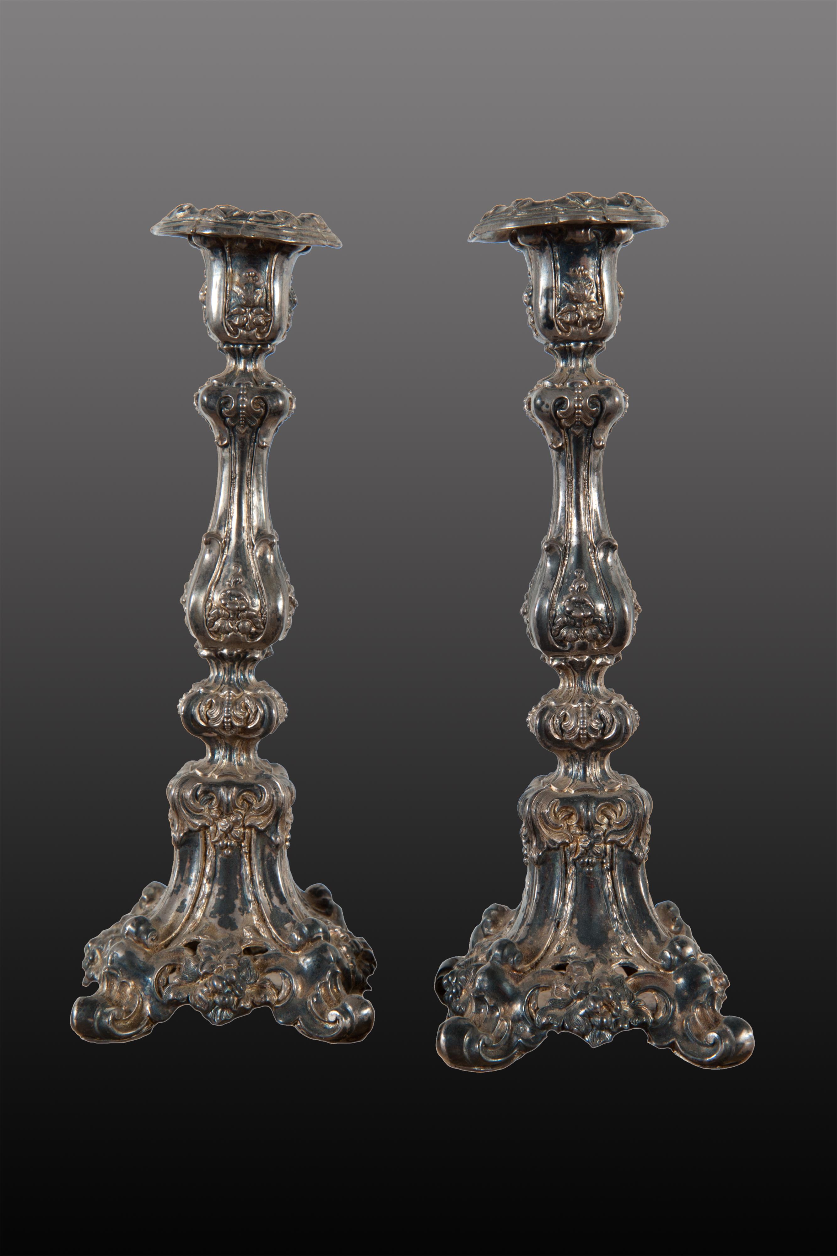 Coppia di candelieri in argento a sbalzo.