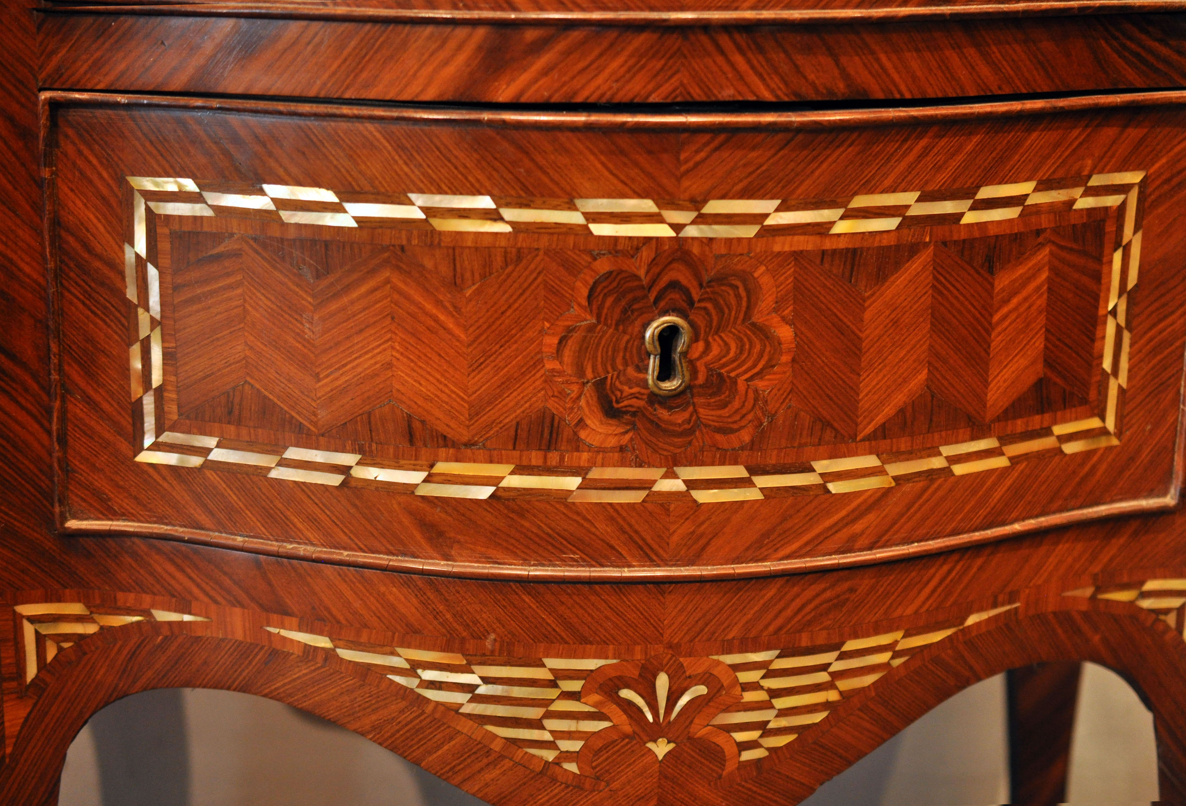 Eccezionale coppia di comodini a 3 cassetti in ebano viola e bois de rose, con intarsi in madreperla.