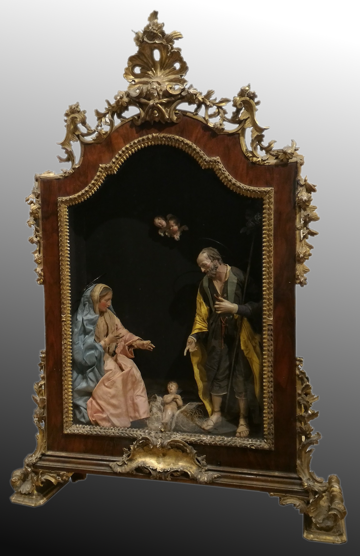 La Natività, attribuita a Lorenzo Mosca (attivo dal 1760 al 1780), è inserita in una teca Luigi XV in noce con fregi dorati anche detta "scarabattola", tipico mobiletto di legno e vetro contenente nel proprio interno la scena della Natività che nel '700 arredava le case dei napoletani.